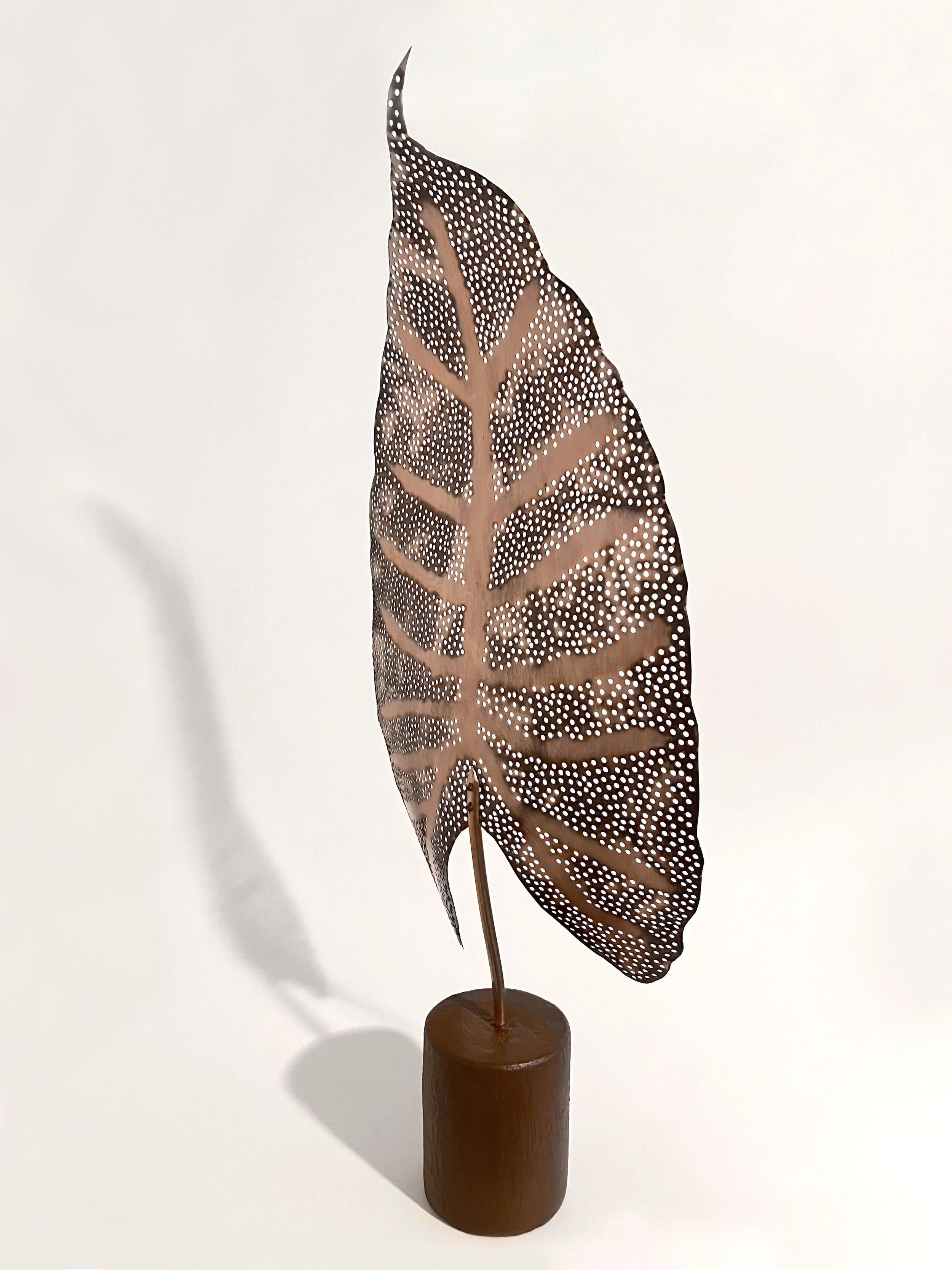 The copper leaf is part of a series of copper leaves reflecting on the beauty and diversity of Australian native flora. The repetitive drilling of the holes allowed time for the contemplation of nature and its amazing ability to adapt to an ever changing environment including and increasingly dry climate, fires, floods, mining, the necessity of farming, the constant creep of suburbia and mankind’s destructive habits. Mankind may be able to imitate some aspects of nature but what of nature’s biodiversity? In the future will it be possible to replace nature with man made? The future of the human race may depend on the outcome.